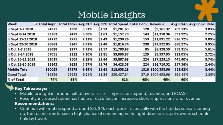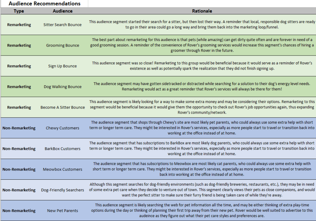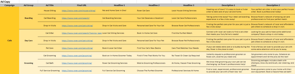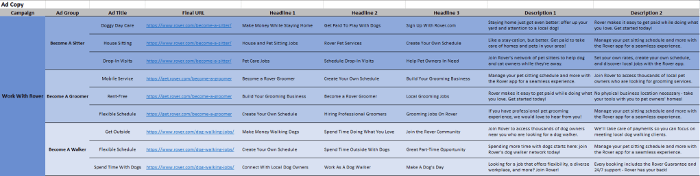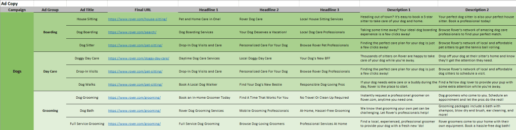 For this interview project, I was asked to build a mock Google Ads campaign and present a weekly report for Rover.com. I really enjoyed this process!